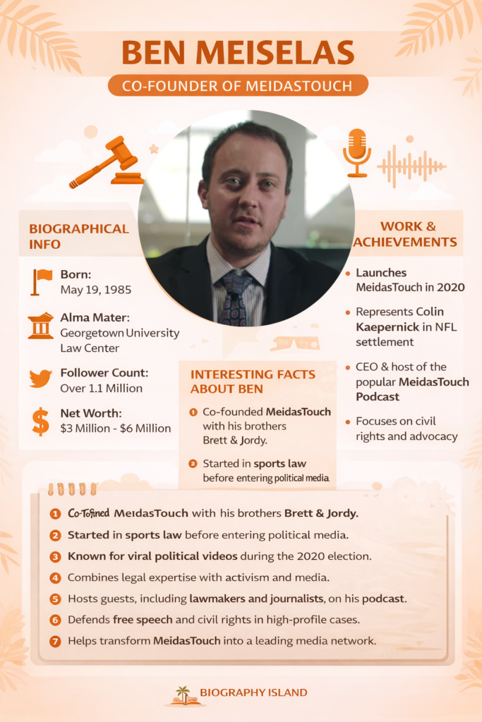 Ben Meiselas has built a strong reputation as an attorney, political commentator, and media entrepreneur. He is best known as a co-founder of MeidasTouch, a progressive political media network that has gained national attention for its viral political content and bold messaging. Through his work, Ben has positioned himself at the intersection of law, activism, and digital media, where he advocates for accountability and voter awareness.