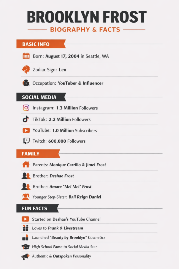 Family plays a visible role in the life and online content of Brooklyn Frost. She was born into a close-knit household led by her parents, Monique Carrillo and Jimel Frost, who have both appeared in social media discussions surrounding the Frost family. Brooklyn grew up alongside her brothers, including the well-known comedian and YouTuber Deshae Frost, whose viral skits and prank videos helped introduce her to a wider audience.