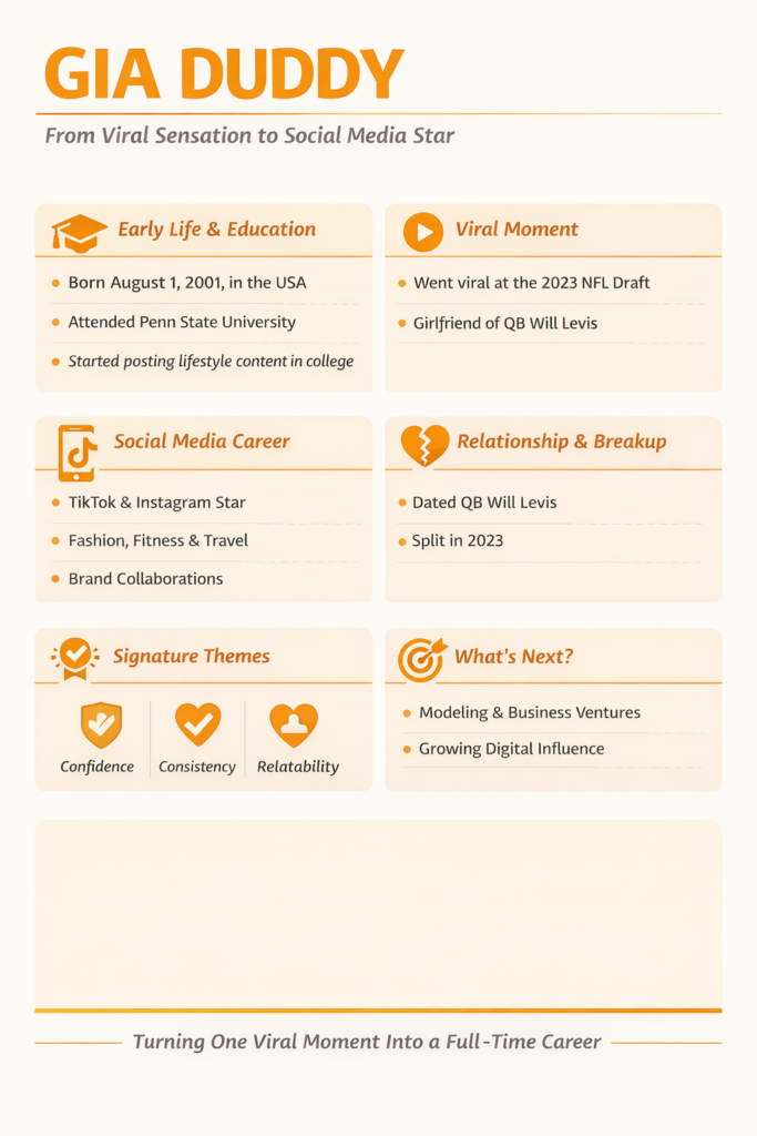 Following the draft, Gia Duddy expanded her presence on TikTok and Instagram, where she shares lifestyle videos, fashion looks, fitness routines, travel diaries, and candid day-in-the-life clips. Her content feels polished but not distant—she often speaks directly to viewers as if chatting with friends.