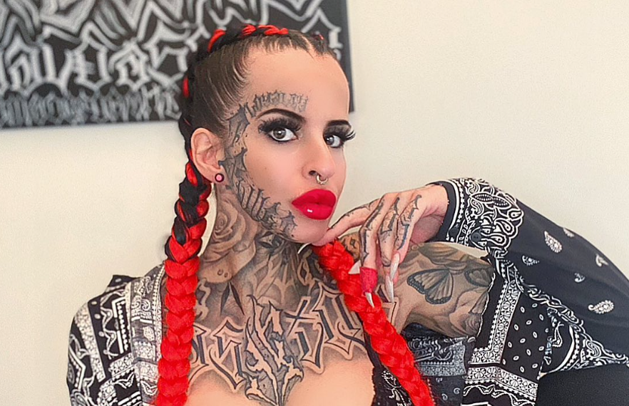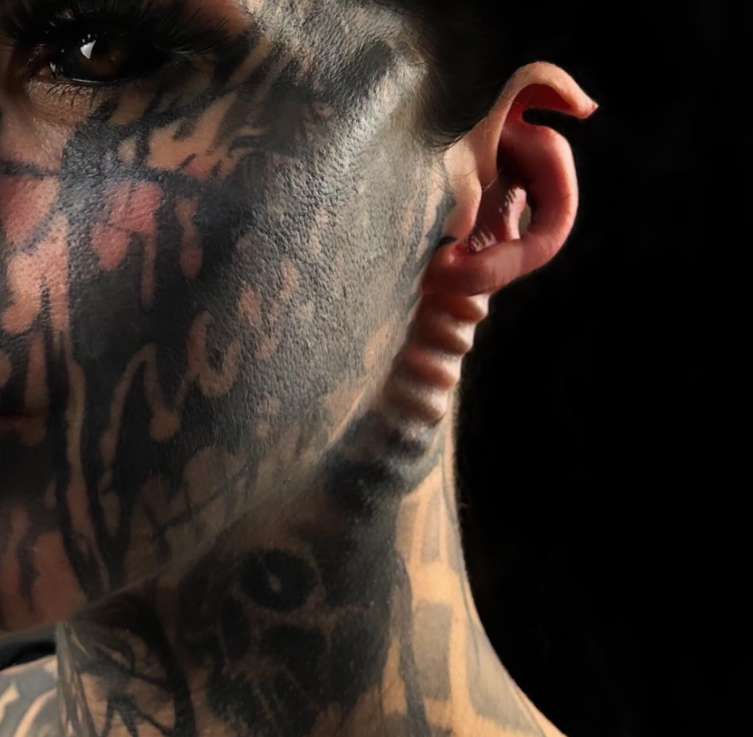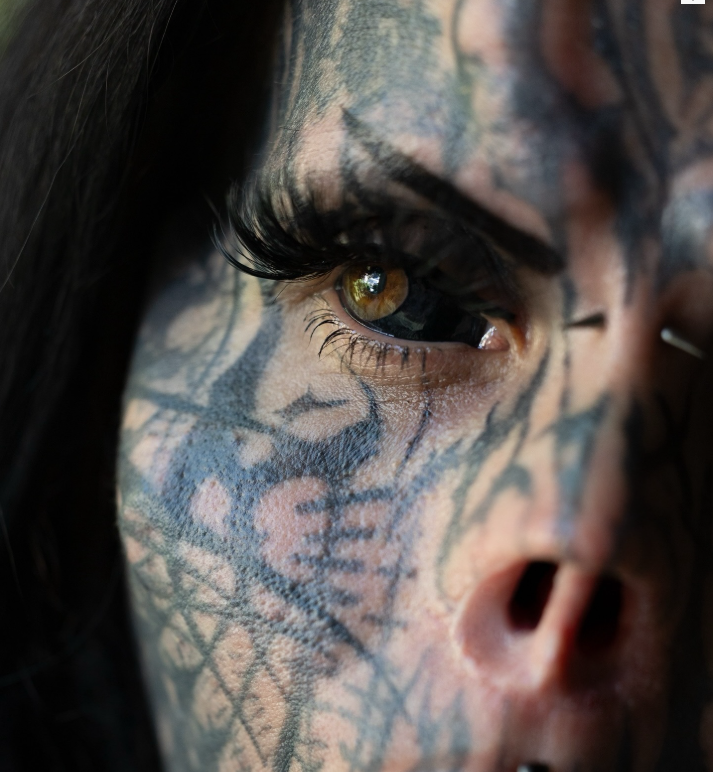 Her eyes? Also tattooed. The whites are filled with dark ink, giving her a stare that’s hard to ignore and even harder to forget. It’s one of those choices that makes people do a double take… then a third.