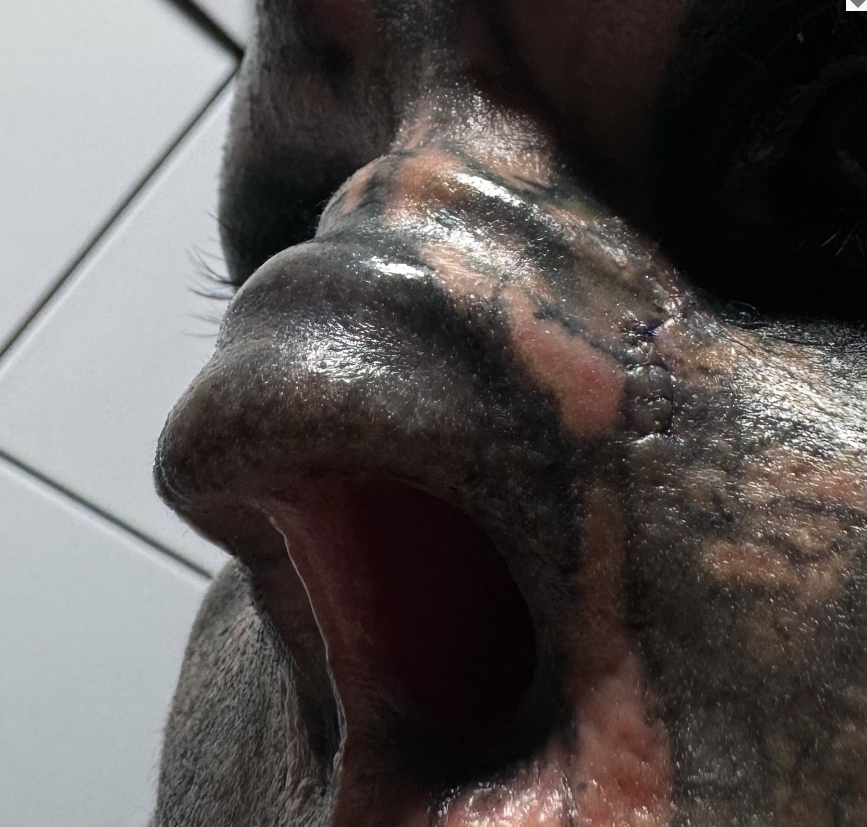 She also has a split tongue, creating that forked effect, along with horn-like implants under her forehead. They sit beneath the skin but still push outward, changing the shape of her face in a way that feels almost otherworldly.